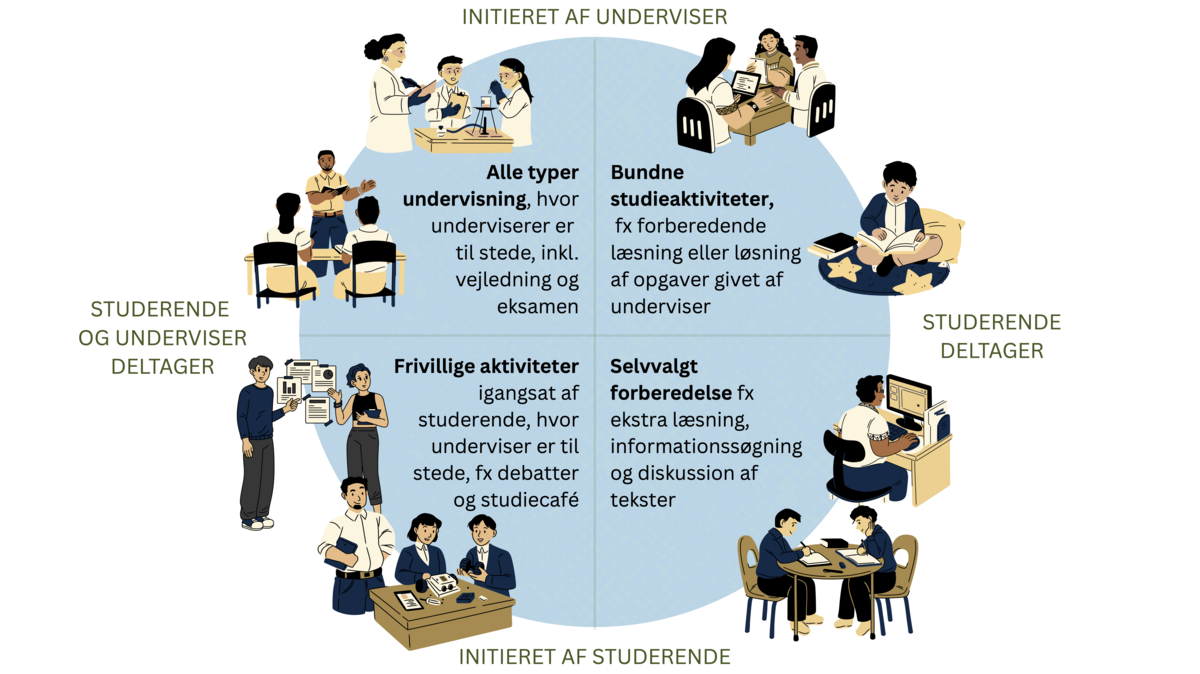 | Eksempler på aktiviteter | Alle typer af undervisning, hvor underviser er tilstede Vejledning Feedback Eksamen | Studerendes forberedelse, der er rammesat af underviser Projekt og gruppearbejde Online læringsaktiviteter i de studerendes forberedelsestid Skriftlig eksamen Feltarbejde Undervisningsevaluering | Studerendes forberedelse, der er på eget initiativ Arbejde i studiegruppen på eget initiativ (fx gennemgang af tekster eller diskussion af faglige emner) Litteratursøgning Studiecafé Udarbejdelse af studieprodukter | Fremlæggelse af studieprodukter Temadage Debatarrangementer Studievejledning Egen opsamling på gruppearbejde |