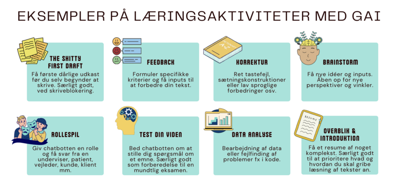 GAI og chatbots kan benyttes som en værdifuld ressource fx til at generere idéer, kreative inputs og producere tekst. Derfor har GAI også potentiale til at støtte undervisere og studerende i deres arbejde, hvis teknologien anvendes bevidst, reflekteret og med en kritisk tilgang. Her er nogle eksempler på, hvordan GAI chatbots kan anvendes i undervisningen: