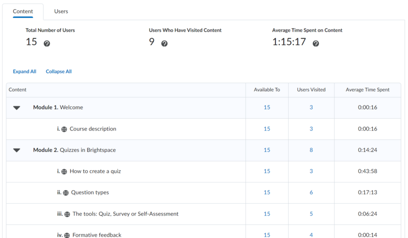 På Brightspace kan underviserne se data om de studerendes aktivitet og interaktion med læringsaktiviteterne tilgås på flere måder. Undervisere kan bl.a. tilgå de forskellige Course Tool statistikker (quizzer, discussions, assignments, surveys. mv.), kursets Grade Center og kursets Content Report. Her kan undervisere se data, der f.eks. angiver tidsforbrug i kursets indholdselementer, interaktion med videoer og quizzer eller mængden af skrevne indlæg i diskussionsfora. Her er det vigtigt at være opmærksom på, at data ikke er en 1:1 repræsentation af virkeligheden, men information, der kan give en indikation på aktivitet og interaktion i kurset.